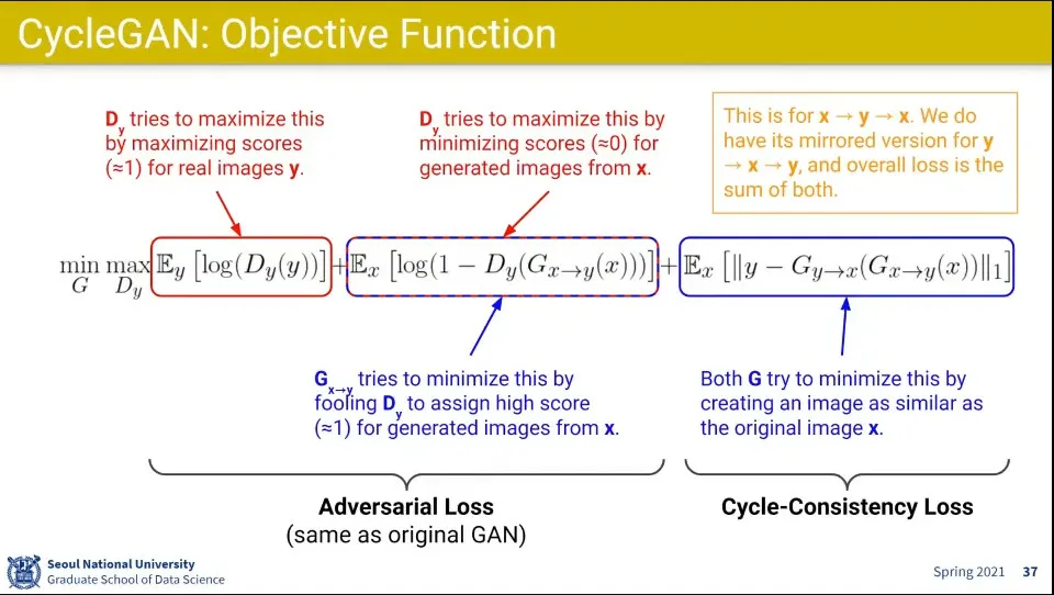 CycleGAN의 수식의 앞부분은 기존 GAN과 유사함. 다만 x에서 y로 변환한 것이 사용된다는 부분만 차이가 있음