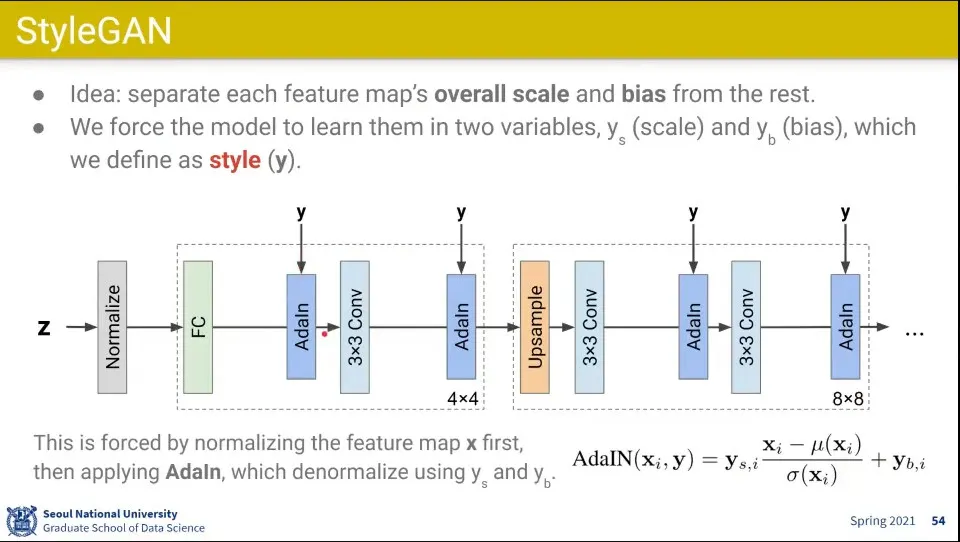 일단 이전 layer를 통과한 데이터에 대해 normalize(평균을 뺴고 분산으로 나눔) 시킨 후에 거기에 scale을 곱하고 bias를 더해서 style을 입힘. 이걸 AdalN이라고 부름