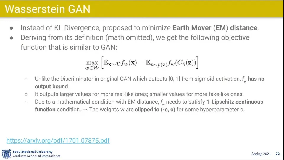 KL Divergence 대신에 Earth Mover(EM) Distance를 사용함
