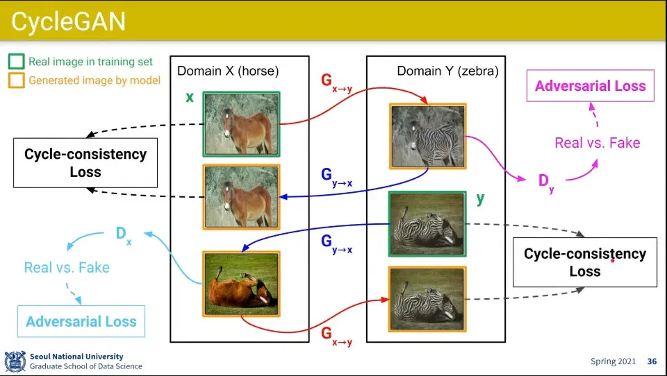 X를 Y로 바꾼 것에 대해 real, fake를 구분하는 adversal loss를 적용하고, 그렇게 바꾼 Y를 다시 X로 바꿀 때 원본 X와 같은지를 판별하는 Cycle-consistency Loss를 적용함