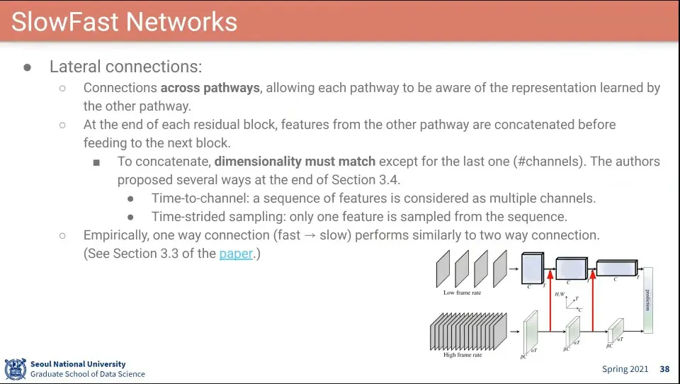 위 구조로 그냥 학습 시켰더니 좀 잘 안되서, Fast의 중간 결과를 Slow에서 받거나 Slow의 중간 결과를 Fast에서 받아서 처리하는 식으로도 해봤는데, 결과적으로는 Fast에서 Slow로 가는 것만해도 성능은 잘 나왔다고 함.
