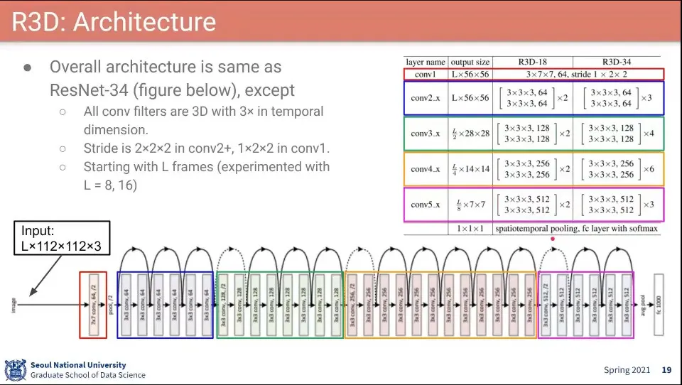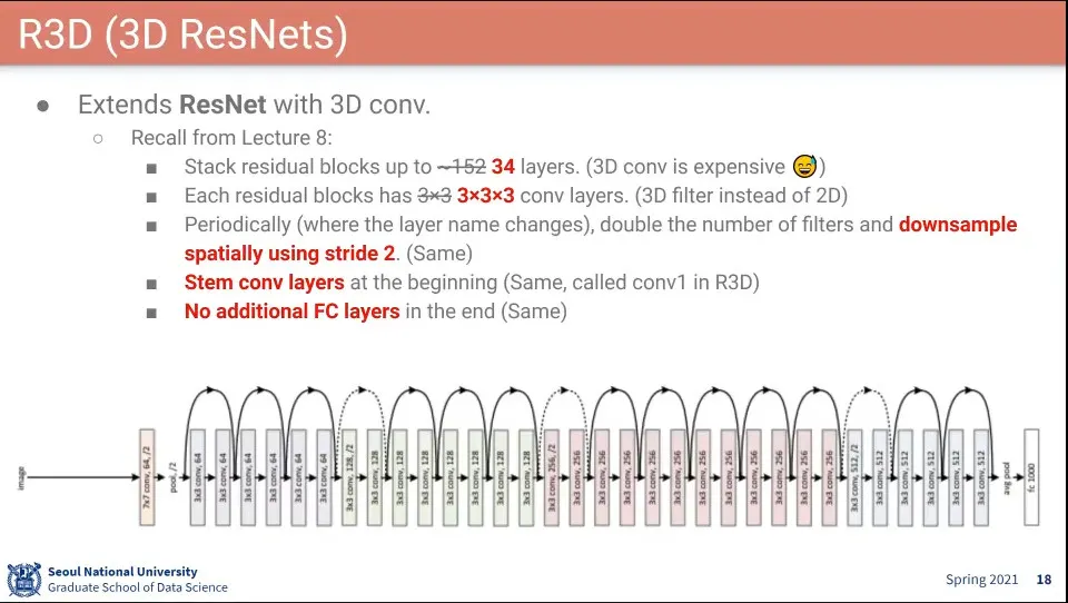 원래 ResNet은 152층을 쌓았지만 3D는 너무 커서 34층으로 줄임
