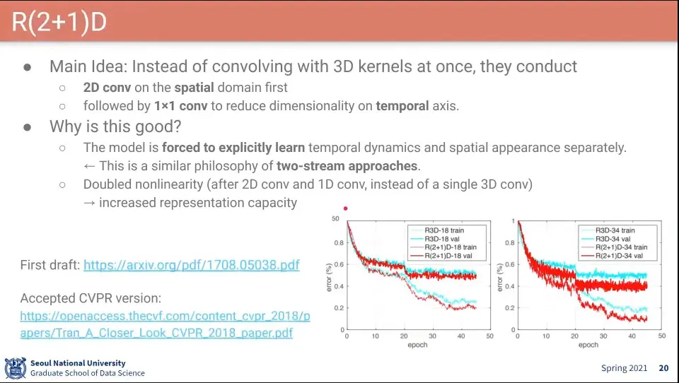 R2+1는 3D 커널로 한번에 하지 않고, 시간쪽 filter와 공간쪽 filter를 쪼개서 학습함