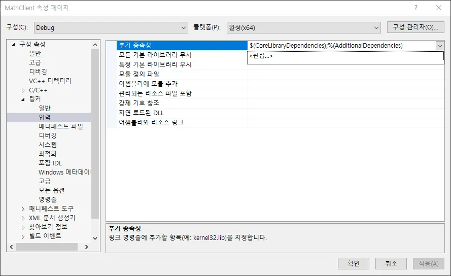 위 DLL 이름이 MathLibrary.lib 였다면 그 이름을 입력한다.