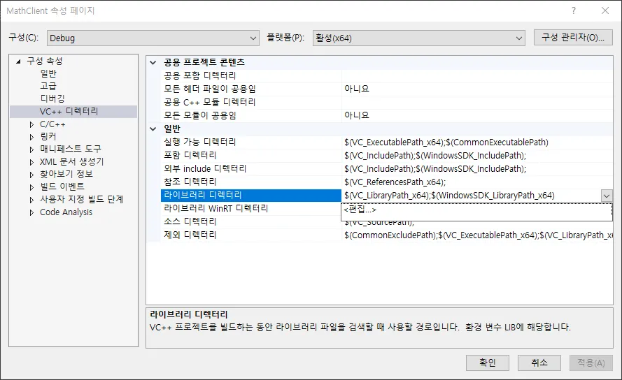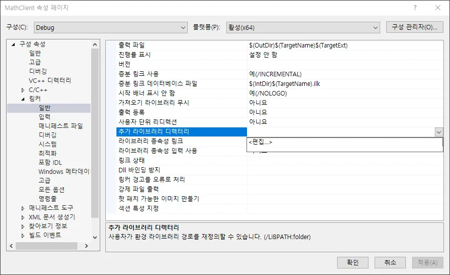 다음으로 DLL 프로젝트의 lib 파일들이 있는 경로를 링커 → 일반 → 추가 라이브러리에 추가한다.