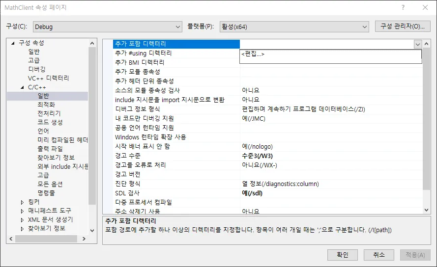 우선 DLL 프로젝트의 header 파일들이 있는 경로를 C/C++ → 일반 → 추가 포함 디렉터리에 추가한다.