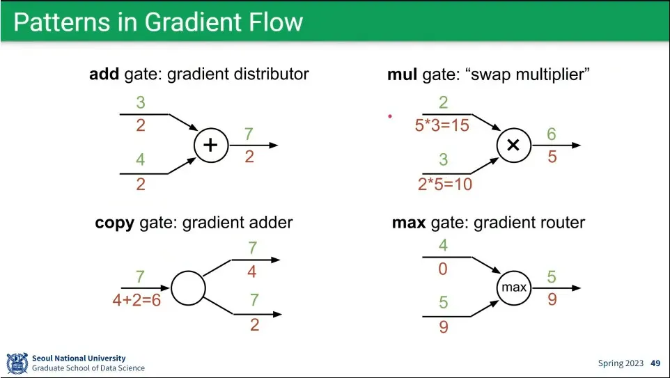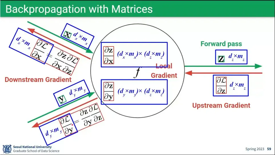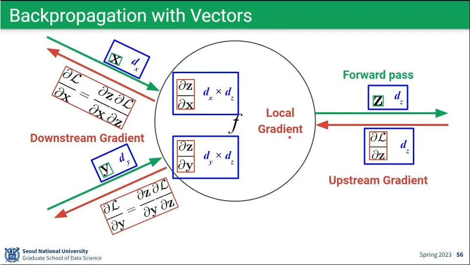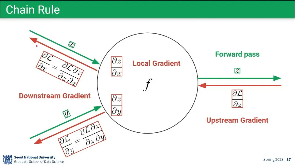 backpropagation은 upstream gradient에 local gradient를 곱하면 downstream gradient가 된다. 이게 chain rule.