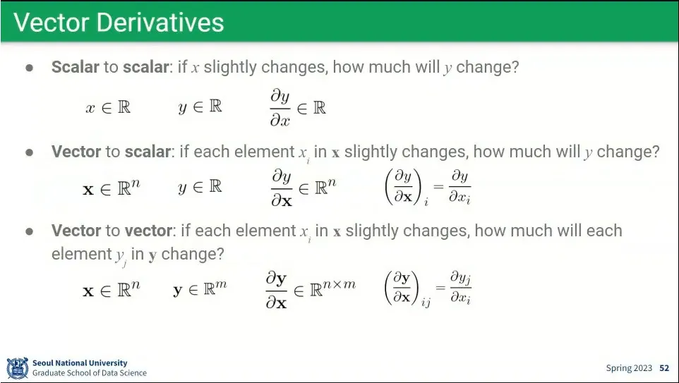 앞선 예시는 scalar를 이용한 것이었는데, 대부분의 경우 vector나 matrix를 이용하게 됨. 하지만 계산을 여러 번 하는 것일 뿐 그 방법은 동일하다.