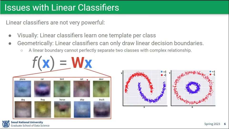 Linear 모델은 근본적으로 한계가 있음. 오른쪽 아래처럼 non-linear 한 경우에는 처리가 안