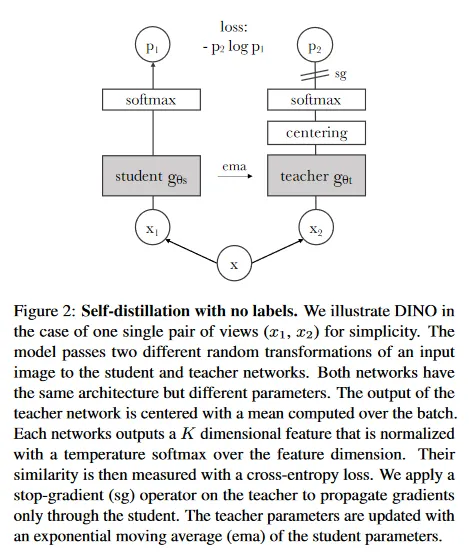 이 작업을 위해 사용된 프레임워크인 DINO는 최근 self-supervised 접근과 동일한 전반적인 구조를 공유한다. 그러나 우리의 접근은 knowledge distillation와도 유사성을 공유하고, 우리는 이 각도에서 제시한다. 우리는 그림 2에서 DINO를 소개하고 Algorithm 1에서 pseudo-code 구현을 제시한다.