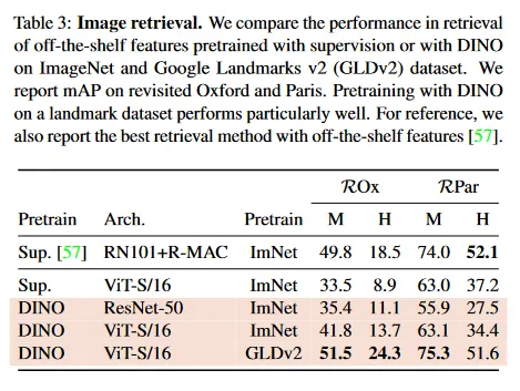 우리는 Oxford와 Paris 이미지 검색 데이터셋을 다시 고려한다. 이것들은 점진적인 난이도를 가진 query/database pair의 3가지 다른 분할을 포함한다. 우리는 Medium(M)과 Hard(H) 분할에 대한 Mean Average Precision(mAP) 을 리포트한다. Table 3에서 supervised 또는 DINO 학습을 사용하여 얻은 다양한 off-the-shelf의 feature의 성능을 비교한다. 우리는 feature를 freeze하고 검색을 위해 k-NN을 직접 적용한다. DINO feature가 라벨링으로 ImageNet에서 학습된 것을 능가함을 관찰한다. SSL 접근의 이점은 어떠한 형태의 주석도 필요 없이 모든 데이터셋에서 학습될 수 있다는 것이다. 우리는 Google Landmark v2(GLDv2)에서 1.2M 깨끗한 집합에서 DINO를 학습한다. 이 데이터셋은 검색 목적으로 설계된 랜드마크이다. GLDv2에서 학습된 DINO ViT feature는 매우 뛰어나며, 이전에 공개된 off-the-shelf descriptor 기반 방법들을 능가한다.
