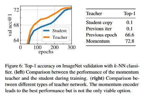 그림 6(오른쪽)에서 우리는 momentum teacher 외에도 student 네트워크의 이전 인스턴스에서 teacher를 구축하는 다양한 전략을 비교한다. 우선 이전 epoch의 student 네트워크를 teacher로 사용하는 것을 고려한다. 이 전략은 memory bank[73]에서 사용되었거나 clustering hard-distillation의 형태로 사용되었다. 두 번째, 이전 iteration에서 student network를 사용하는 것과 아니라 student의 copy를 teacher로 사용하는 것을 고려한다. 이 설정에서 최근 버전의 student에 기반한 teacher를 사용하는 경우 수렴하지 않고, 이러한 설정은 작동하기 위해 더 많은 normalization이 필요하다. 흥미롭게도 이전 epoch의 teacher를 사용하는 것은, 붕괴하지 않고 k-NN 평가에서 MoCo-v2나 BYOL 같은 기존 프레임워크와 비교하여 경쟁력 있는 성능을 제공한다. 모멘텀 인코더를 사용하는 것이 이 순진한 teacher 보다 명확히 우수한 성능을 제공하지만, 이 발견은 teacher에 대한 대안을 조사할 여지가 있음을 시사한다.