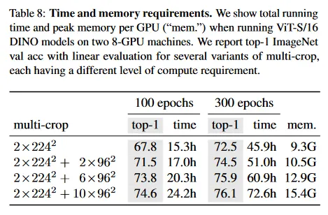 Table 8에서 우리는 2대의 8-GPU 머신에서 ViT-S/16 DINO 모델을 실행할 때의 소요되는 시간과 GPU 메모리 요구량의 세부사항을 보인다. 우리는 여러 multi-crop 학습의 변형을 리포트하며, 각 변형은 서로 다른 수준의 계산 요구량을 갖다. 우리는 table 8에서 볼 수 있듯이, multi-crop을 사용하면 DINO 실행 시 정확도/실생시간의 trade-off가 개선된다. 예컨대 multi-crop 없이() 48시간 동안 학습한 후에 성능은 72.5%이지만 의 crop 설정에서는 24시간만에 74.6%에 도달한다. 이것은 2배 적은 시간으로 2%의 개선이다. 다만 메모리 사용량은 더 높다(15.4G vs 9.3G). 우리는 multi-crop으로 인한 성능 부스트가 설정에서 더 많은 학습으로는 따라 잡을 수 없음을 관찰했으며, 이는 ‘local-to-global’ 증강의 가치를 보인다. 마지막으로 더 많은 뷰를 추가해도 학습이 길어지면 이득이 감소한다(6배에서 crop으로 +0.2%)