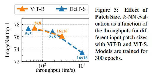 그림 5에서 우리는 16x16, 8x8, 5x5의 다양한 패치 크기로 학습된 ViT-S 모델의 k-NN 분류 성능을 비교한다. 또한 16x16과 8x8의 ViT-B와도 비교한다. 모든 모델은 300 epoch 동안 학습된다. 우리는 패치의 크기가 감소함에 따라 성능이 매우 개선되는 것을 관찰한다. 추가적인 파라미터 없이 성능이 매우 개선될 수 있다는 점이 흥미롭다. 그러나 더 작은 패치를 사용할 때 얻는 성능 이득은 처리량의 비용을 치른다. 5x5 패치를 사용할 때 처리량은 8x8 패치와 비교하여 44 im/s vs 180 im/s가 된다.