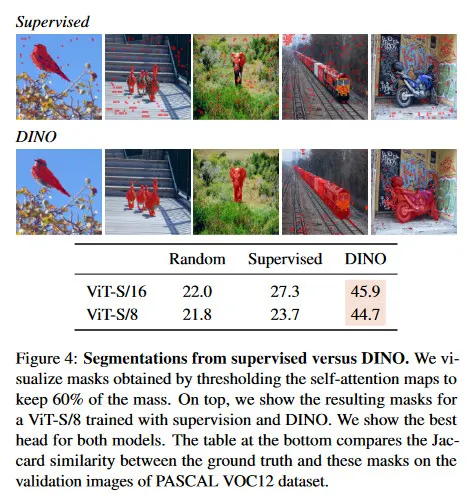 그림 4에서 supervised ViT가 질적, 양적으로 무질서한 환경에서 객체를 잘 attend 하지 못하는 것을 볼 수 있다. 우리는 self-attention map을 ground truth와 질량의 60%까지 유지하도록 thresholding하여 얻은 segmentation mask와의 Jaccard 유사도를 리포트한다. self-attention map은 smooth하고 마스크를 생성하는데 최적화되지 않았음에 유의하라. 그럼에도 불구하고 supervised와 DINO 모델 사이에 Jaccard 유사도에서 분명한 차이를 볼 수 있다. self-supervised convnet 또한 segmentation에 관한 정보를 포함 하지만 이것을 가중치에서 추출하기 위해 전용 방법이 필요하다.