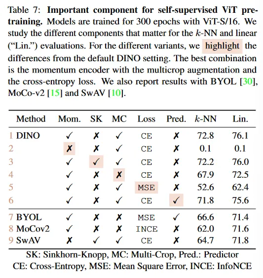 우리는 우리의 프레임워크에서 학습된 ViT에 self-supervised에 다양한 컴포넌트를 추가하는 효과를 보인다. Table 7에서 우리는 컴포넌트를 추가하거나 제거하는 모델의 다양한 변종을 리포트한다. 우선 우momentum이 없는 경우 우리의 프레임워크는 잘 동작하지 않고(2 행) 붕괴를 피하기 위해 SK와 같은 더 고급 작업이 필요하다. 그러나 모멘텀이 있는 경우 SK를 사용해도 큰 영향이 없다(3 행). 게다가 3행과 9행을 비교하면 성능에 대한 모멘텀 인코더의 중요성이 강조된다. 두 번째, 4행과 5행에서 DINO의 multi-crop training과 cross-entropy loss를 사용하는 것이 좋은 feature를 얻는데 중요한 컴포넌트임을 관찰한다. 또한 student 네트워크에 predictor를 추가하는 것이 작은 효과를 갖는데, 이는 BYOL에서 붕괴를 방지하는데 핵심이다. 완전성을 위해, 우리는 부록 B에서 이 ablation 연구의 확장된 버전을 제공한다.