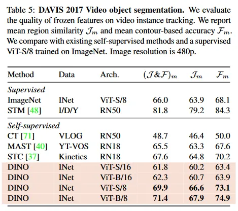 Table 5에서 우리는 DAVIS-2017 video instance segmentation 벤치마크에서 출력된 패치 토큰을 평가한다. 우리는 Jabri et al에서 실험 프로토콜을 따르고, 연속된 프레임 사이의 nearest neighbor를 사용하여 장면을 segment한다. 따라서 이 feature 위에 모델을 학습하거나 이 작업을 위한 가중치도 fine-tune 하지 않는다. Tab 5에서 우리의 학습 목적이나 아키텍쳐가 dense task를 위해 설계된 것이 아님에도 이 벤치마크에서 경쟁력 있는 성능을 보인다. 네트워크가 fine-tune 되지 않았기 때문에 모델의 출력은 어떤 공간적 정보를 유지하고 있어야 한다. 마지막으로 이 dense 인식 작업에서 작은 패치(”/8”)의 변종은 훨씬 성능이 좋다(ViT-B에 대해 +9.1%).