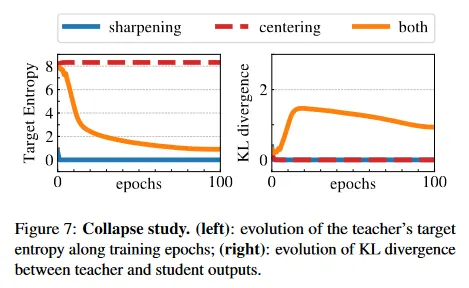 KL이 라는 것은 상수 출력을 나타내고, 따라서 붕괴를 의미한다. 그림 7에서 centering과 sharpening이 있고 경우와 없는 경우에 학습 중 entropy와 KL을 plot한다. 한 가지 작업이 누락되면, KL은 으로 수렴하고 붕괴를 나타낸다. 그러나 엔트로피 는 서로 다른 값으로 수렴한다. centering 없을 떄는 으로, sharpening 없을 때는 으로 수렴하며, 두 작업이 서로 다른 형식의 붕괴를 유도한다는 것을 나타낸다. 두 연산을 모두 적용하면 이러한 효과가 균형을 이룬다(sharpening 파라미터 의 연구는 부록 D 참조).