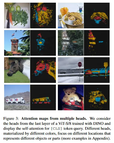 그림 3에서 서로 다른 head가 이미지의 다른 semantic 영역에 attend 할 수 있음을 볼 수 있다. 이것은 심지어 차폐(세번 째 행에서의 bushes)이거나 작더라도(두 번째 행에서의 깃발) 마찬가지이다. 시각화는 480p 이미지로 얻어졌으며 ViT-S/8의 경우 3601개의 토큰 시퀀스를 생성한다.
