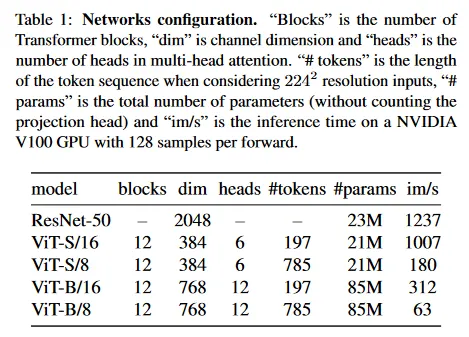 우리는 Vision Transformer(ViT)의 메커니즘을 간략히 설명한다. Transformer에 관한 상세한 내용은 Vaswani el al[70], 이미지에 대한 적용dms Dosovitskiy et al[19]를 참조하라. 우리는 DeiT[69]에서 사용된 구현을 따른다. 이 논문에서 사용된 다양한 네트워크의 설정은 Table 1에서 요약한다. ViT 아키텍쳐는 해상도 의 non-overlapping 연속 이미지 패치의 grid를 입력으로 취한다. 이 논문에서는 일반적으로 (”/16”) 또는 (”/8”)을 사용한다. 그 다음 패치는 embedding의 집합을 형성하기 위해 linear layer를 통과한다. 우리는 이 시퀀스에 추가 학습 가능한 토큰을 추가한다. 이 토큰의 역할은 전체 시퀀스의 정보를 취합하는 것이며, 우리는 이것의 출력에 projection head 를 붙인다. 이전 연구와의 일관성을 위해 이 토큰을 class token [CLS]라 부르지만, 어떤 라벨이나 supervision과 연결되지 않는다. 패치 토큰과 [CLS] 토큰 집합은 ‘pre-norm’ layer normalization을 사용하는 표준 Transformer 네트워크에 공급된다. Transformer는 self-attention과 feed-forward layer의 시퀀스로 구성되며 skip connection이 병렬로 배치된다. self-attention 레이어는 attention 메커니즘을 통해 다른 토큰 representation을 참조하여 토큰 representation을 업데이트한다.