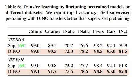Tab 6에서 우리는 DINO로 pre-trained인 feature 품질을 다양한 downstream 작업에서 평가한다. 우리는 ImageNet에서 supervision으로 학습된 동일한 아키텍쳐의 feature와 비교한다. Touvron et al[69]에서 사용된 프로토콜을 따르며, 각 downstream task에서 feature를 fine-tune한다. ViT 아키텍쳐의 경우, self-supervised pre-training이 supervision으로 학습된 feature 보다 더 잘 전이 된다는 것을 관찰할 수 있으며, 이것은 convolutional 네트워크에서의 관찰과 일관성이 있다. 마지막으로 self-supervised pre-training은 ImageNet에서 결과를 매우 개선한다(+1-2%)