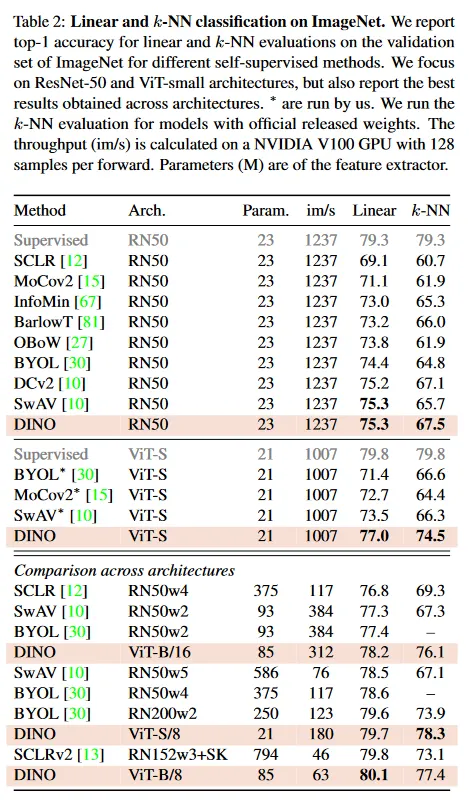 Table 2의 상단 패널에서 우리는 DINO를 동일한 아키텍쳐를 사용하는 다른 self-supervised 방법과 비교한다. 이것은 ResNet-50 또는 ViT-small(DeiiT-S의 설계를 따름)이다. ViT-S의 선택은 여러 측면에서 ResNet-50과의 유사성에 의해 동기부여 받았다. 파라미터의 수(21M vs 23M), 처리량(1237/sec vs 1007im/sec), [69]의 학습 절차를 사용한 ImageNet에서의 supervised 성능 (79.3% vs 79.8%). 우리는 부록 D에서 ViT-S의 변종을 탐구한다. 우선 DINO가 ResNet-50에서 최첨단과 동등한 성능을 보이는 것을 관찰한다. 이는 DINO가 표준 설정에서 잘 작동함을 보여준다. ViT로 교체할 때, DINO는 BYOL, MoCov2와 SwAV를 선형 분류에서 +3.5%, k-NN 평가에서 +7.9% 능가한다. 더 놀랍게도 간단한 k-NN 분류기를 사용한 성능이 선형 분류기와 거의 동등하다(74.5% vs 77.0%). 이 속성은 DINO을 ViT 아키텍쳐와 함께 사용할 때만 나타나고 다른 기존의 self-supervised 방법이나 ResNet-50에서는 드러나지 않는다.