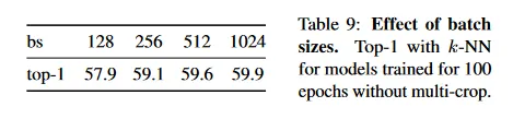 Table 9에서 우리는 DINO를 사용하여 얻은 feature에 대해 배치 크기의 효과를 연구한다. 또한 부록 D에서 방정식 4의 centering update 규칙에서 사용된 smooth 파라미터 의 효과를 연구한다. 우리는 배치 크기에 따라 learning rate를 선형적으로 확장한다. . table 9에서 작은 배치 크기로도 높은 성능의 모델을 학습할 수 있음을 확인한다. 더 작은 배치 크기(bs = 128)를 사용하는 결과는 우리의 기본 학습 설정 bs=1024 보다 약간 낮고, momentum rate와 같은 하이퍼파라미터를 재조정해야 한다. 128의 배치크기를 사용하는 실험은 단지 1대의 GPU에서 실행했음에 주목하라. 우리는 8의 배치크기를 갖는 모델을 학습하는 것도 탐구했다. 50 epoch 이후에 35.2%에 도달했으며, GPU 당 이미지를 간신히 맞출 수 있는 큰 모델을 학습할 수 있는 가능성을 보인다.