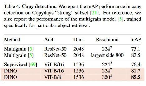 우리는 DINO를 사용하여 학습된 ViT의 copy detection 작업에서의 성능을 평가한다. 우리는 INRIA Copydays 데이터셋의 ‘strong’ 부분 집합에서 mean average precision을 리포트한다. 이 작업은 blur, insertion, print, scan 등으로 오염된 이미지를 인식하는 것이다. 이전 작업을 따라 우리는 YFCC100M 데이터셋에서 무작위로 샘플링된 10k의 distractor(방해) 이미지를 추가한다. copy detection은 pre-trained 네트워크에서 얻어진 feature에 대해 코사인 유사도를 사용해 직접 수행한다. feature는 출력된 [CLS] 토큰과 GeM 풀링된 출력 패치 토큰을 연결하여 얻어진다. 이는 ViT-B에서 1535d descriptor를 발생시킨다. [5]를 따라 우리는 feature에 whitening을 적용한다. 이 변환은 distractor와 구별되는 YFCC100M에서 무작위로 선택된 추가 20k 이미지에서 학습한다. Table 4는 DINO로 학습된 ViT가 copy detection에서 매우 경쟁력 있음을 보인다.