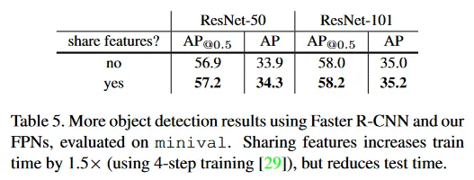 위에서 단순성을 위해 우리는 RPN과 Fast R-CNN 사이의 feature를 공유하지 않는다. Table 5에서 우리는 [29]에서 설명된 4-step 학습을 따라 feature를 공유하는 것을 평가한다. [29]와 유사하게, 우리는 feature를 공유하는 것이 약간 정확도를 개선하는 것을 발견했다. feature 공유는 또한 test 시간을 감소시킨다.