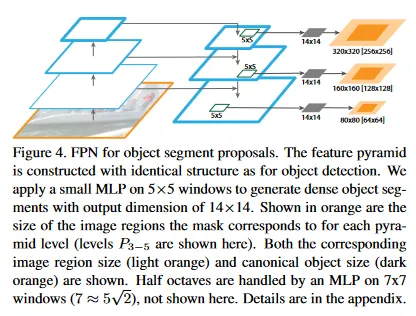 FPN을 mask proposal 생성에 적용하는 것은 쉽다. 우리는 학습과 추론 모두에 fully convolutional 설정을 사용한다. 우리는 섹션 5.1에서와 같이 feature 피라미드를 구성하고 을 설정한다. feature 피라미드의 각 레벨의 상단에 작은 5x5 MLP를 적용하여 fully convolutional 방법으로 14x14 mask와 object score를 예측한다. 그림 4 참조. 추가적으로 [27, 28]의 이미지 피라미드에서 octave 당 2개 scale의 사용한다는 점에 착안하여, 우리는 절반 octave를 다루기 위해 입력 크기 7x7의 두 번째 MLP를 사용한다. 2개 MLP는 RPN에서 앵커와 유사한 역할을 수행한다. 아키텍쳐는 end-to-end로 학습된다. 전체 구현 상세는 부록에 제공한다.