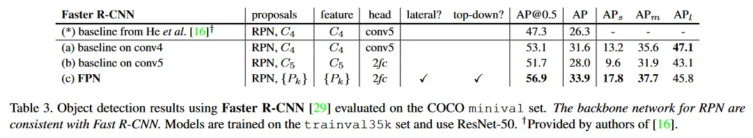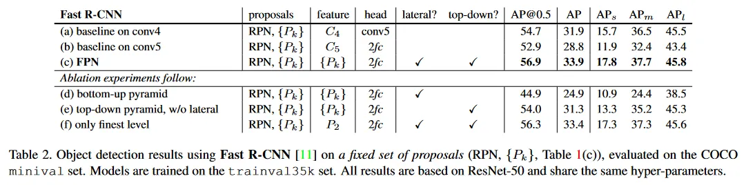 Table 2(c)는 Fast R-CNN에서 우리의 FPN의 결과를 보인다. Table 2(a)의 baseline과 비교하여, 우리의 방법은 AP를 점, small object AP를 점 개선한다. 2fc head를 채택한 baseline(Table 2(b))과 비교하여, 우리의 방법은 AP를 점 개선한다. 이러한 비교는 우리의 feature pyramid가 region-based object detector를 위한 single-scale feature보다 우수함을 나타낸다.