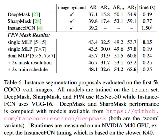 기존 mask proposal 방법은 densely sampled image pyramid([27, 28]에서 로 스케일된)를 기반으로 하여 계산적으로 비싸다. FPN에 기반한 우리의 접근은 상당히 더 빠르다(우리의 모델은 6~7 FPS를 실행한다). 이러한 결과는 우리의 모델이 일반적인 feature extractor이고 다른 multi-scale detection 문제에 대한 image pyramid를 대체할 수 있음을 시연한다.
