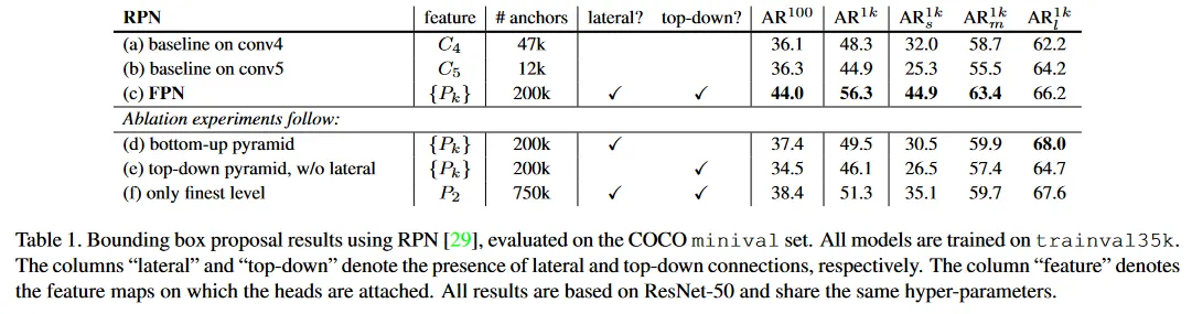 Table 1(e)는 1x1 lateral connection이 없는 top-down feature pyramid의 ablation 결과를 보여준다. 이 top-down pyramid는 강력한 의미론적 feature와 미세한 해상도를 갖는다. 그러나 우리는 이러한 feature의 위치가 정밀하지 않다고 주장한다. 왜냐하면 이러한 map은 여러번 downsampling과 upsampling을 거쳤기 때문이다. feature들의 더 정밀한 위치는 lateral connection을 통해 bottom-up 맵의 더 미세한 레벨에서 top-down 맵으로 직접 전달될 수 있다. 결과적으로 FPN은 Table 1(e) 보다 점 높은 를 갖는다.