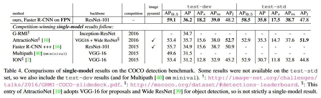 Table 4는 우리의 방법을 추가적인 기법 없이 2016 우승자 G-RMI, 2015 우상자 Faster R-CNN+++을 포함한 COCO 대회 우승자들의 single-model 결과와 비교한다. 우리의 단일 모델 참가작은 이 강력하고 엔지니어링된 경쟁자들을 능가했다. test-dev 집합에서 우리의 방법은 기존 최고 결과 보다 AP의 점( vs )과 AP@0.5의 점( vs ) 향상되었다. 우리의 방법은 이미지 피라미드에 의존하지 않고 단일 입력 이미지 스케일만 사용하면서도 small-scale object에 대해 뛰어난 AP를 보인다는 점이 주목할만하다. 이것은 이전 방법에서는 고해상도 이미지 입력으로만 달성할 수 있었다.