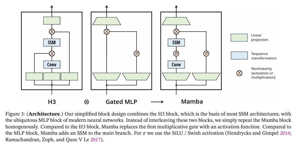 Mamba 자체는 위에 정의된 S6 모델을 이용하는 신경망 아키텍쳐를 의미한다. 이것은 기존에 SSM 아키텍쳐로 널리 쓰이던 H3 아키텍쳐와 Gated MLP를 결합한 구조이다. 아래 그림 참조