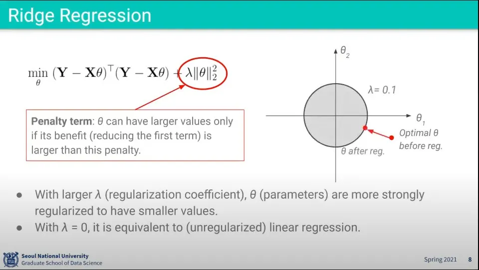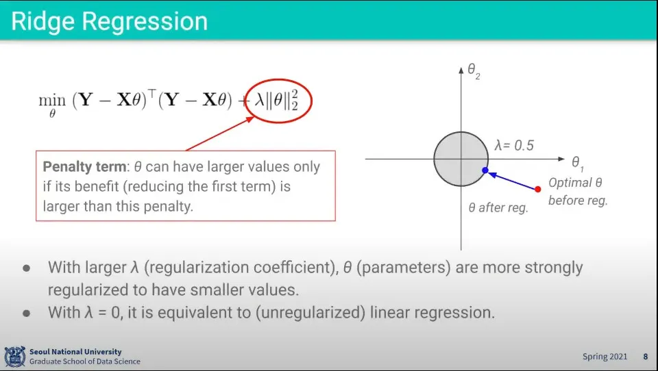 머신러닝에서는 가중치 를 구하게 되는데, 이 를 강제로 더해줘서 규제를 사용함