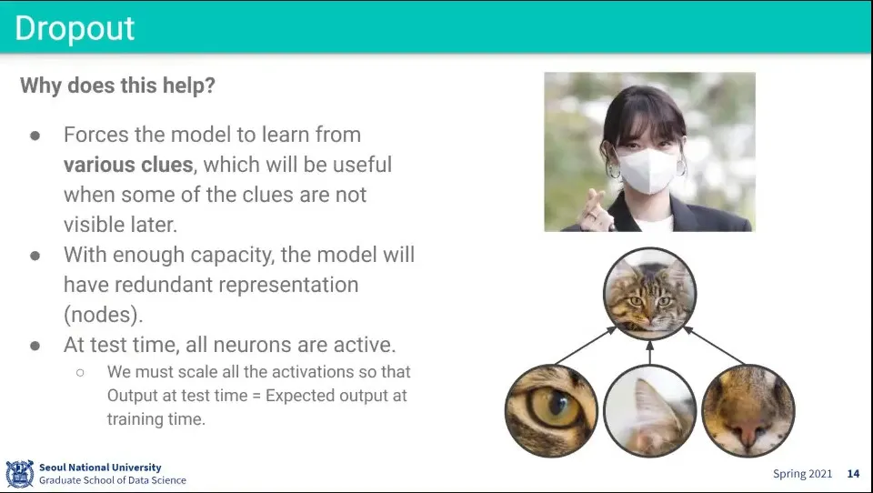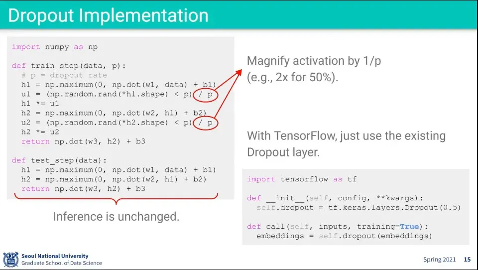 일부 node를 끄면 학습 scale이 달라지기 때문에 그 scale을 맞추기 위해 가려지는 확률만큼 스케일을 키워서 학습해야 한다.