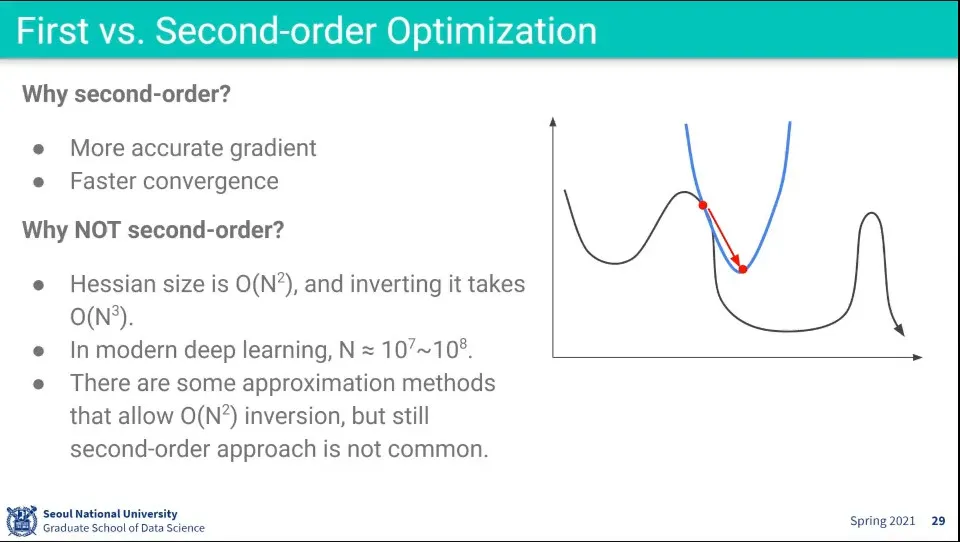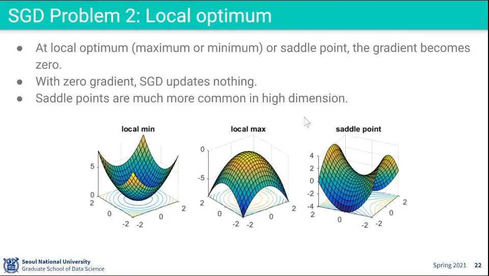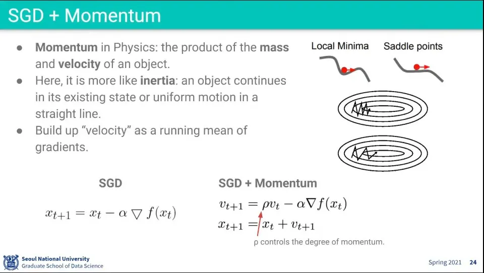 이렇게 하면 saddle point를 통과할 수 있음. 미분은 0이지만 관성이 있었기 때문에 움직일 수 있음