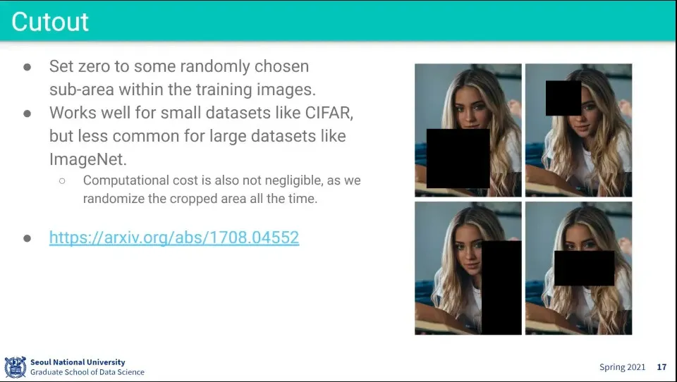 만일 이미지에서 어떤 두드러진 feature가 있다면 컴퓨터가 해당 feature에만 최적화될 수 있음. 그러면 일반화가 안 되기 때문에, 일부러 해당 feature를 가리고 학습시켜서 다른 feature들을 보고도 인식할 수 있게 함.