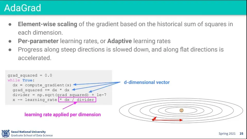 따라서 gradient가 컸던 곳에서는 값을 나눠주므로 작아지게 하고, gradient가 작았던 곳에서는 값을 키워줘서 적절한 방향으로 움직일 수 있게 해줌