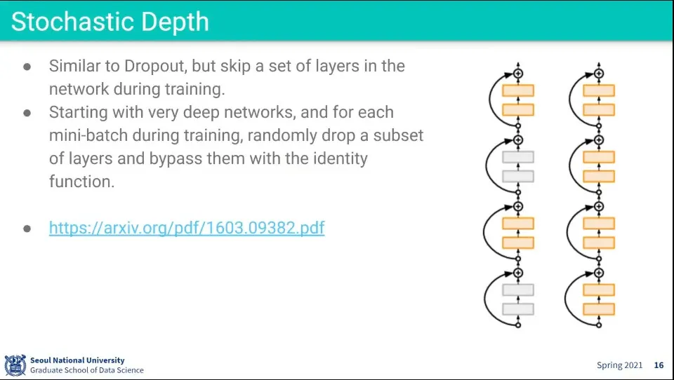 랜덤하게 layer를 건너 띄고 학습하는 것