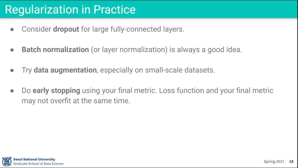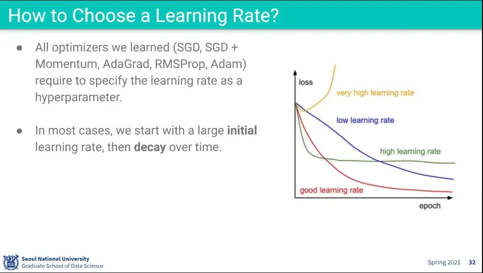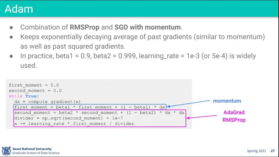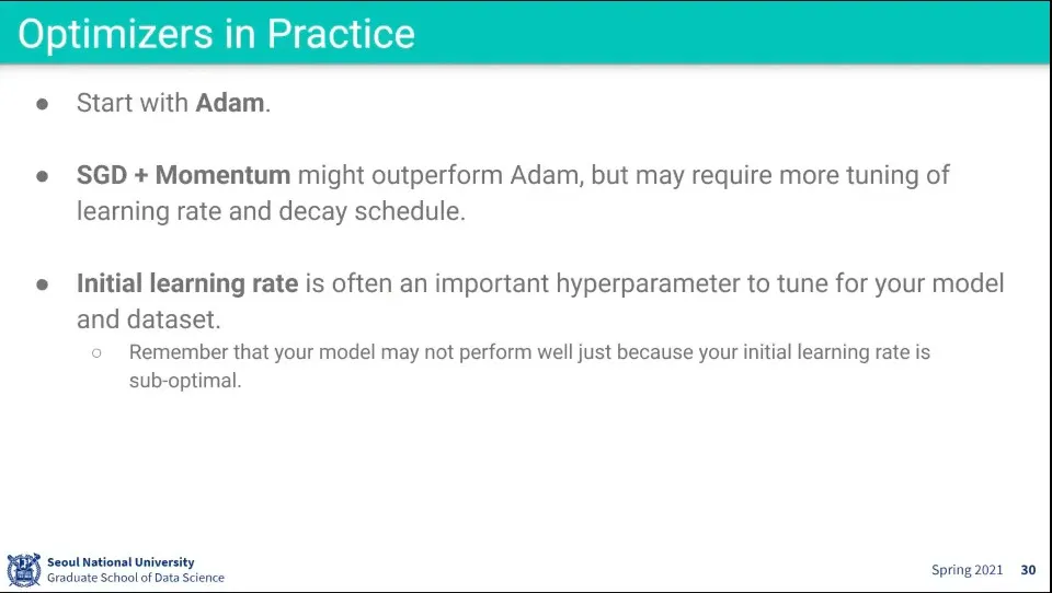 가장 발전된 방법이기 때문에 일단 시작할 때는 Adam으로 시작함