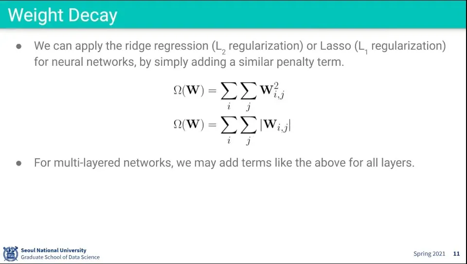 선형회귀에서 Regularization을 했던게 Weight Decay이다.
