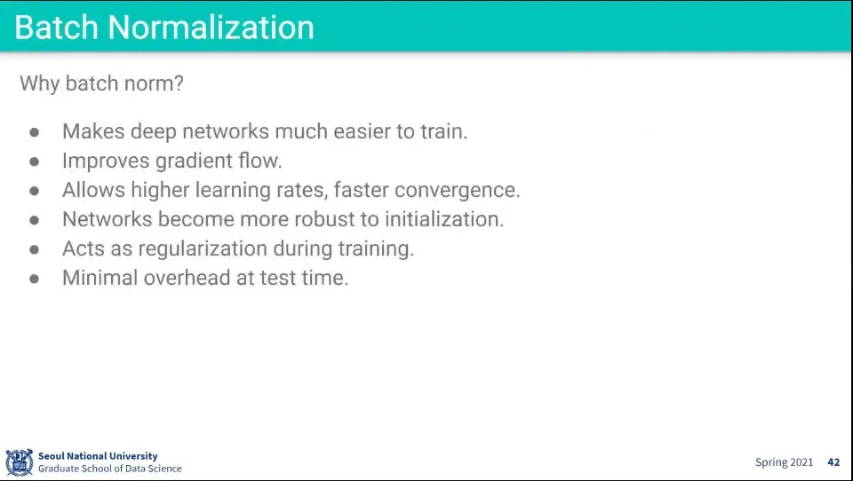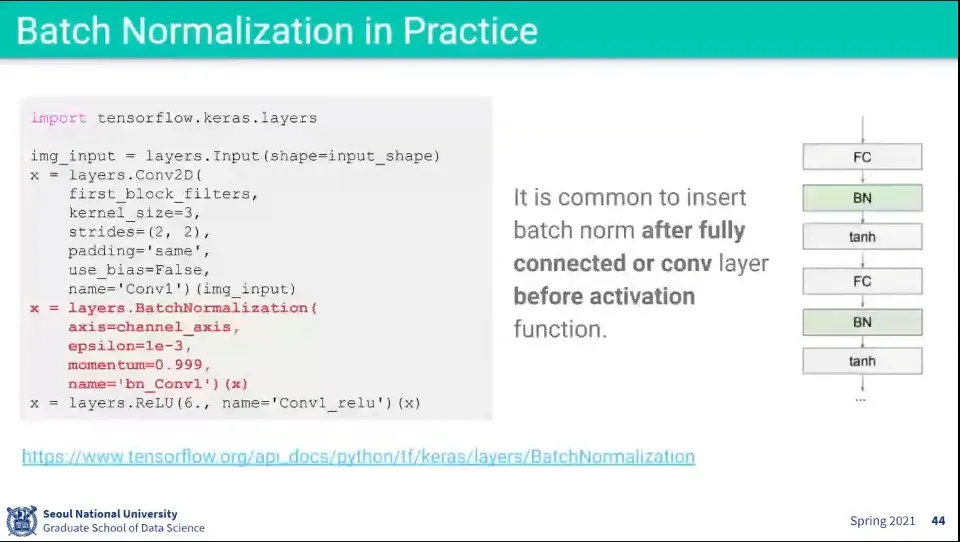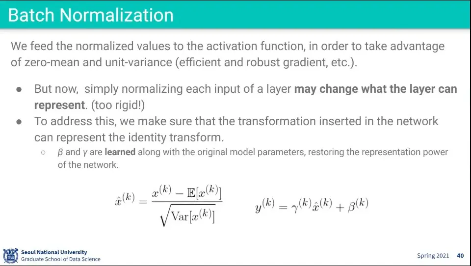 고로 batch normalization 할 때는 앞에 normalization 하는 것과 함께 뒤에 원복하는 것도 넣어줘야 한다.