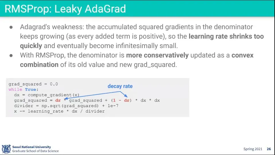 이것을 보완하기 위해 과거 데이터를 decay 시켜 주는게 Leaky AdaGrad. RMSprop이라고도 한다.