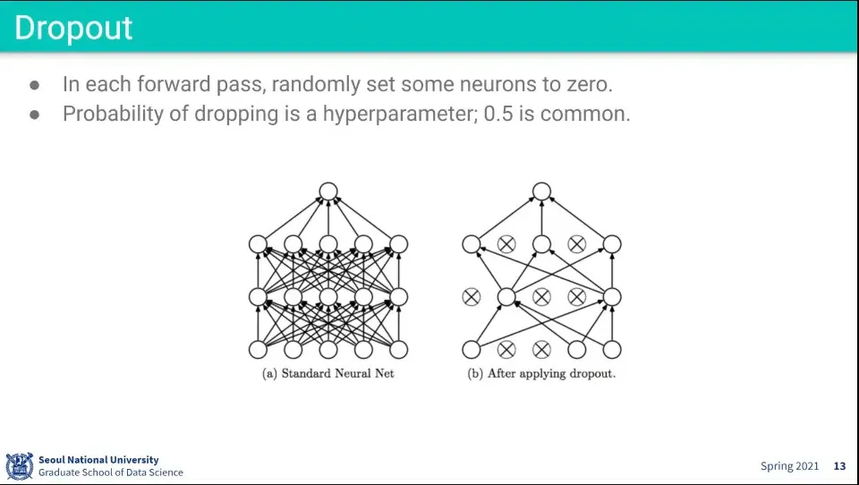 Forward pass에서 일부 노드를 랜덤하게 제거한 후에 학습을 수행하는 것이 Dropout