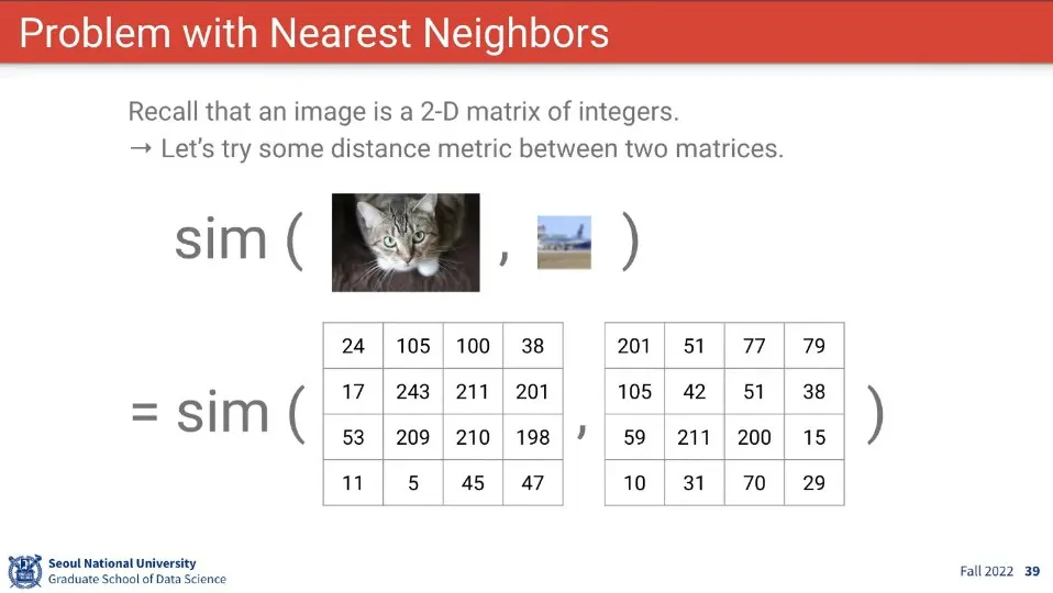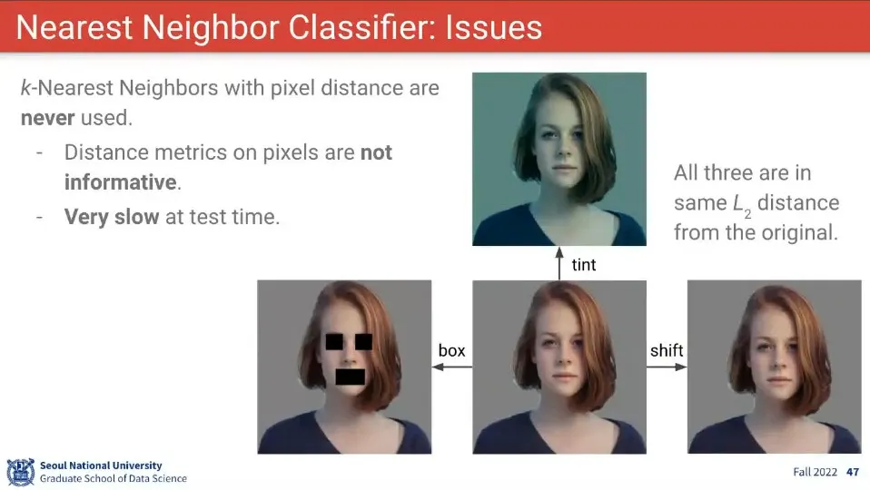 Nearest Neighbor는 이 예시와 같이 사람이 보기에 같은 이미지를 같다고 판별해 주지 못하기 때문에 이미지 분류 문제에서는 사용하지 않는다.