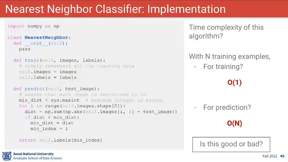 다만 이렇게 하면 학습할 때는 O(1)의 시간이 걸리지만, 예측할 때 O(N)의 시간이 걸려서 좋은 방법이 아님.