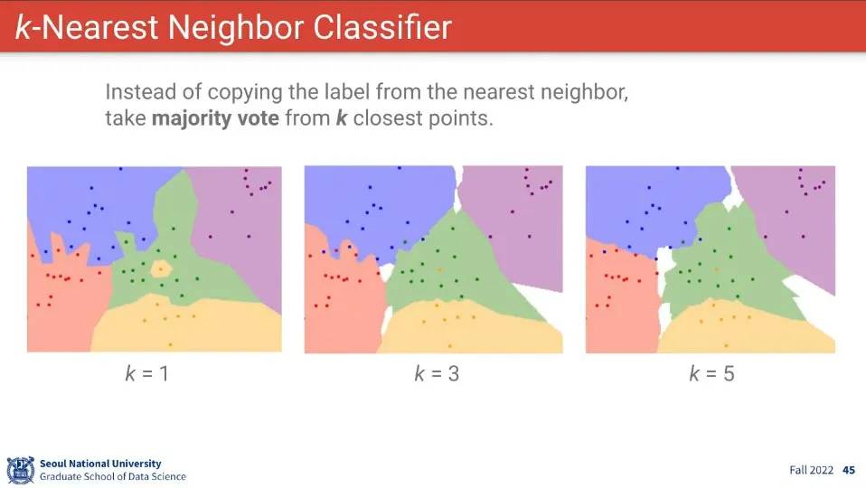 k-Nearest Neighbor는 가장 가까운 k개의 점을 이용해서 판단하는 방식. —다수결 방식