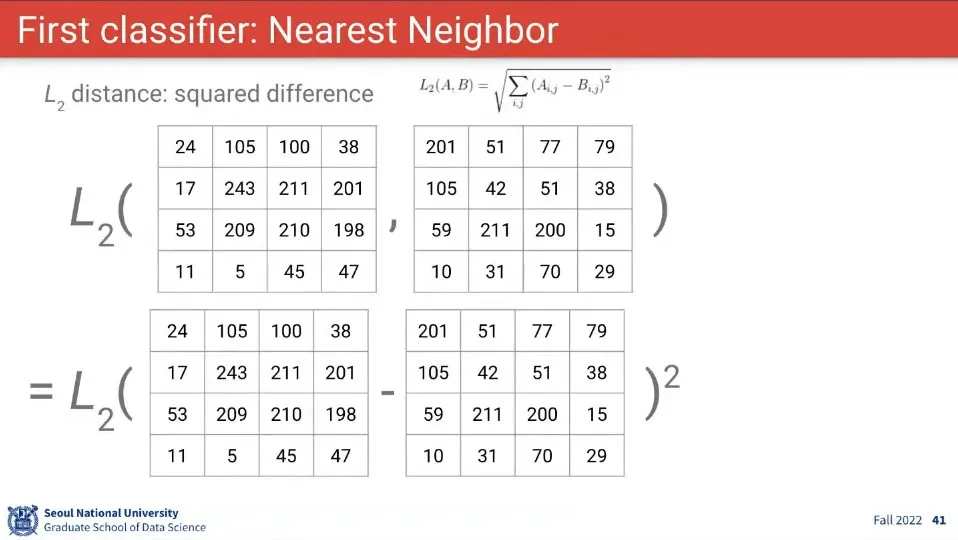두 이미지의 차이(거리)를 계산하는 방법으로는 L1, L2 Distance가 있음